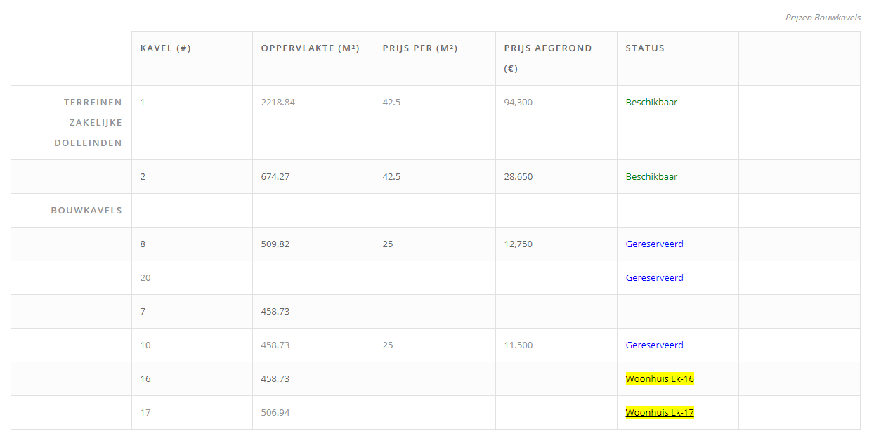Prijzen en beschikbaarheid bouwkavels: zie onderstaand tabel